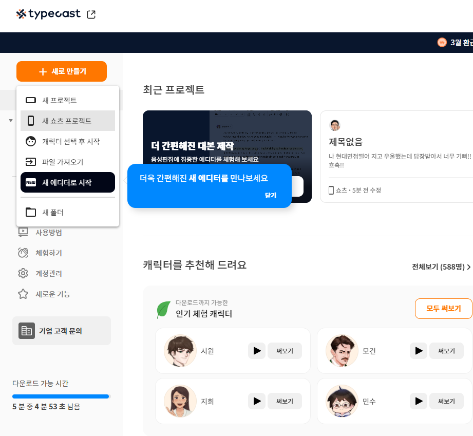TTS 사이트중 하나인 타입캐스트에 회원가입을 하면 무료로 기본 TTS를 만들수 있다.
