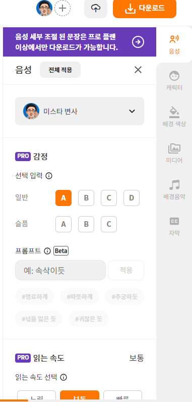 P.S 오른쪽 다양한 억양은 플랜을 가입하면 사용할수 있다.